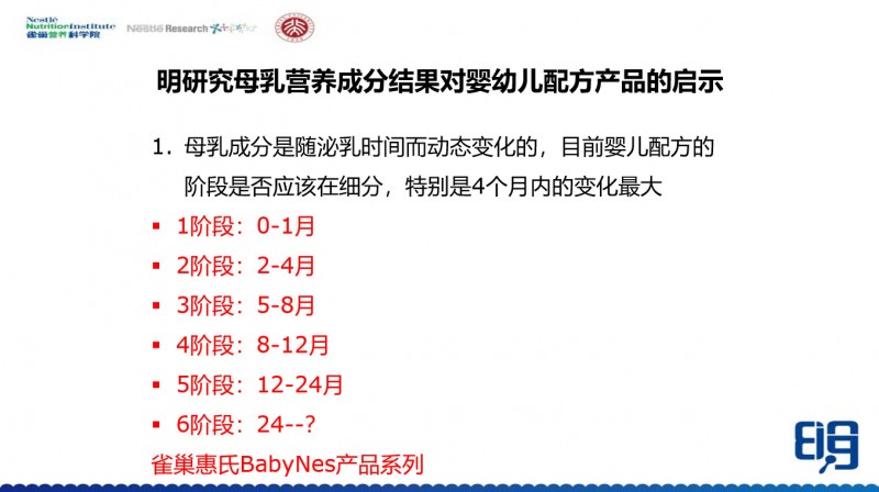 第一,母乳的成分是随着泌乳时间动态变化的,那么我们是否将来应该再细分,按照这个变化的时间段来生产相应的配方。比如0-1月,1-2月,2-4月,越细会越好。这可能意味着加工成本的增加,但对婴儿可能是最合适的。