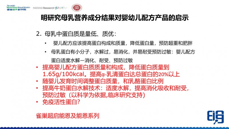 所以在这里建议的是,我们在做婴儿配方的时候,在提高蛋白质构成和质量的基础上,是否能够把蛋白质的量降到1.65g/100kcal。现在研究表明,1.65g/100kcal是可以跟母乳喂养的情况接近的。