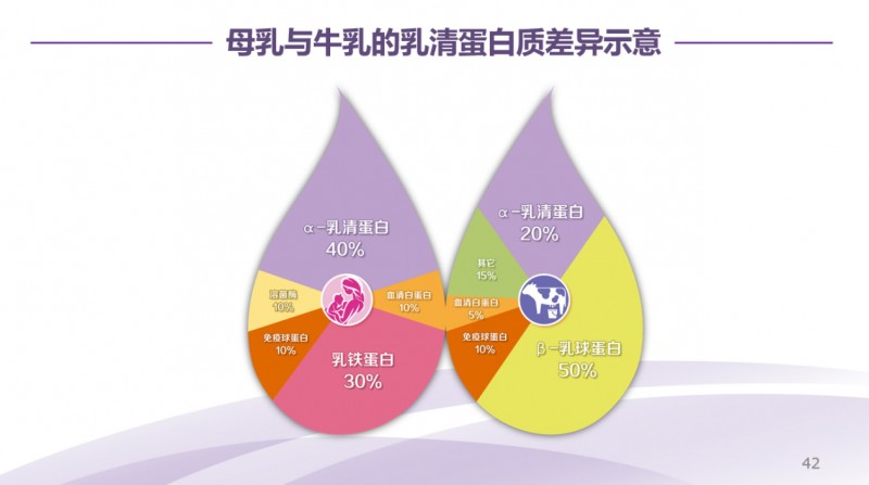 关于乳清蛋白,可能这张图更明显的。牛乳和人的母乳中,蛋白质构成完全不一样。左边这张图是母乳中的乳清蛋白构成,右边这张图是牛奶中的乳清蛋白构成。
