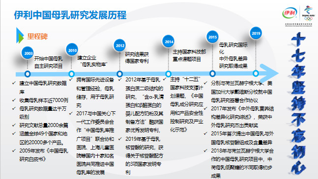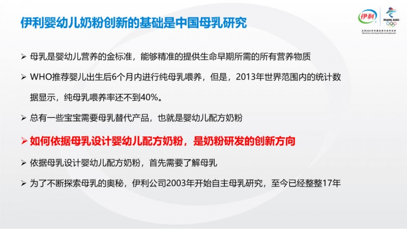 如何去依据母乳去设计婴幼儿配方奶粉的配方,已经是所有婴幼儿奶粉研发的一个创新的方向。所以伊利公司为了探索母乳的奥秘,在2003年就开始自主研究中国的母乳,到现在已经整整有17年的历史了。