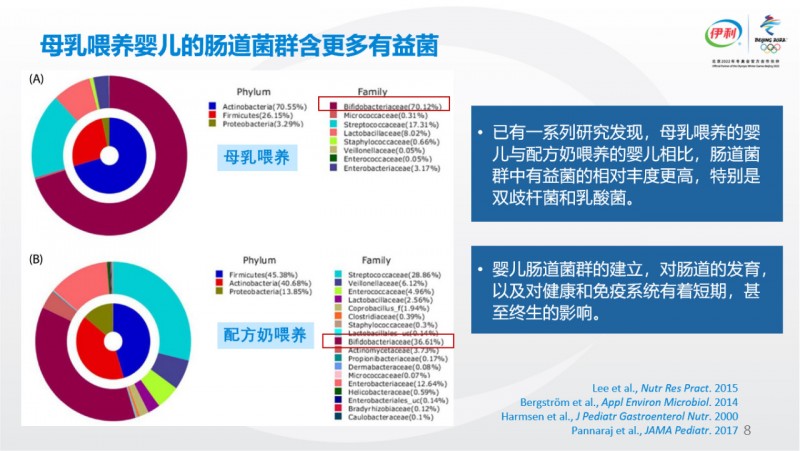 已经有一系列研究证明,母乳喂养的婴儿与配方粉喂养的婴儿相比,肠道有益菌的丰度会相对高一些。婴儿肠道菌群的建立,对肠道的发育,以及对未来的健康和免疫系统都有着短期甚至终生的影响。这个我就不详述了,这是前面几位讲者大家共同关注的一个话题。
