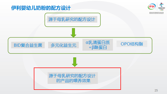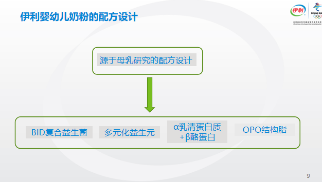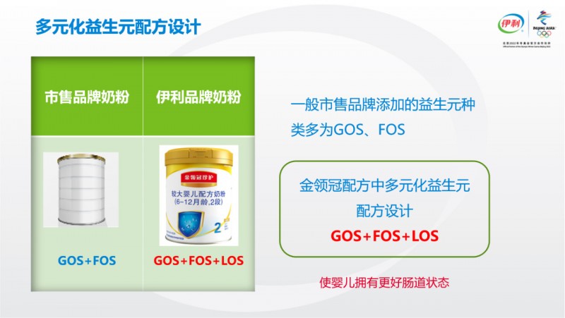 伊利婴幼儿配方奶粉的设计,在肠道健康方面有四项举措,包括BID复合益生菌、多元化的益生元、蛋白质方面添加了母乳中重要的两种蛋白质α乳清蛋白和β酪蛋白、脂肪方面添加了OPO结构脂。