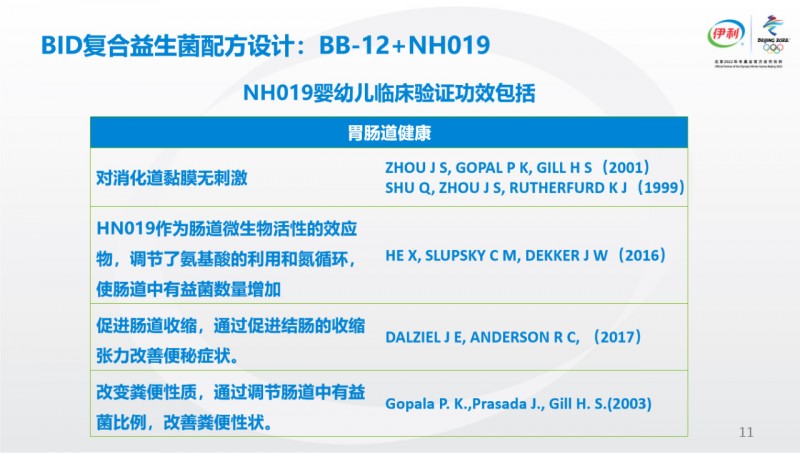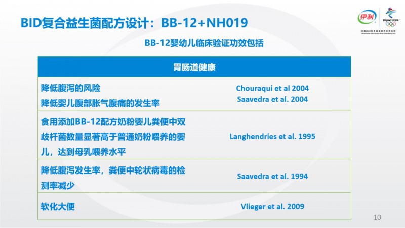 BID复合益生菌设计上,我们是添加了两种菌,一个是BB-12这种动物双歧杆菌,另外一个就是NH019乳双歧杆菌。BB-12大家讲到很多,我就不讲了。