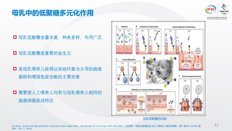 除了益生菌,我们再看在益生元的方面,大家知道母乳低聚糖是非常丰富的,种类很多,作用也很广泛,母乳低聚糖是最重要的益生元,是婴儿获得以双歧杆菌为主导的肠道菌群,以及增强免疫功能的主要因素。