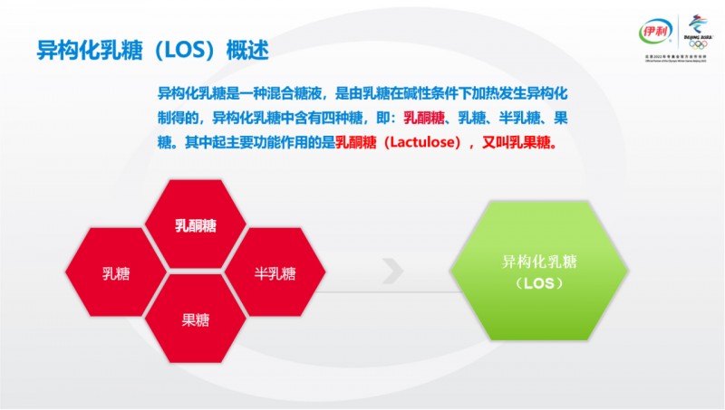 异构化乳糖是一种混合的糖液,是由乳糖在碱性条件下加热发生异构化制得的,异构化乳糖含有四种糖,其中主要起到功能的作用的是乳酮糖,又叫乳果糖。
