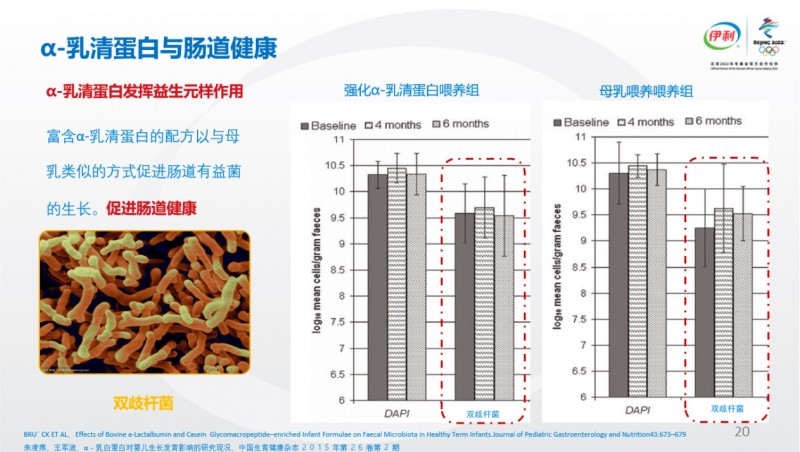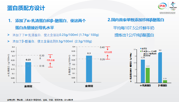 前面雀巢的李总也讲到了,母乳与牛乳的乳清其实是有很大的差异,牛乳的乳清是β-乳球为主,母乳的乳清里几乎不含β-乳球。母乳乳清里面占比最高的是α-乳清蛋白,母乳酪蛋白里面占比最高的是β-酪蛋白,添加α-乳清蛋白和β-酪蛋白,说明伊利已经做到了以母乳蛋白为标准的,更精细的,已经到了蛋白质亚组分的配方设计。
