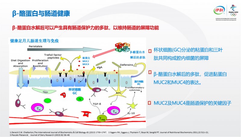 婴儿肠道内的黏蛋白是有肠道屏蔽作用的,它可以屏蔽那些肠道炎性的有害细菌,目前受关注最多的黏蛋白就是MUC2和MUC4这两种。β-酪蛋白水解后的多肽,可以促进MUC2和MUC4的基因表达,从而降低婴儿肠道炎性疾病发生的风险,所以β-酪蛋白与肠道健康也是有直接密切的关系的。