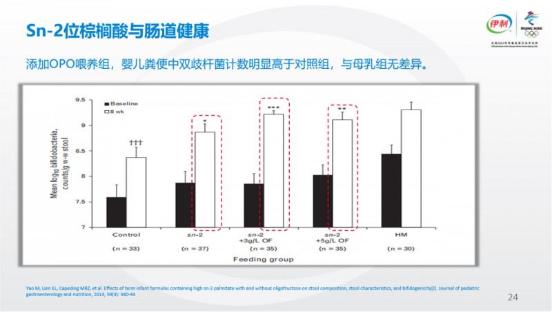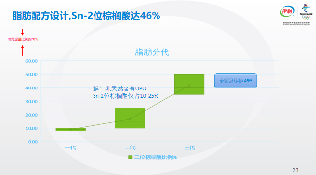第四个我们在肠道健康方面的举措,就是提高Sn-2位棕榈酸的含量。母乳中Sn-2位棕榈酸的含量在棕榈酸中的比例高达70%,我们的配方中Sn-2位棕榈酸的含量可以达到46%,这在行业中也是比较高的。