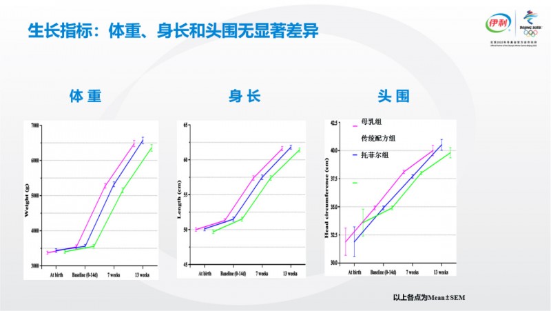 首先要看孩子的基础营养是不是达到了,那么在体重、身长和头围这些生长发育方面,伊利奶粉组、母乳组与传统配方组没有明显差异。都是达标的。