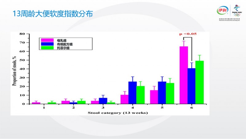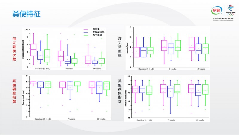 但是在每天的大便的次数上,明显看到母乳组的次数会多一些。在粪便的硬度上,母乳组的硬度是最低的,普通配方粉组的硬度会随着周龄的增加而有所增加,伊利奶粉组的硬度虽然高于母乳,但是低于普通对照组,而且硬度随着周龄增加的这个趋势也不是非常明显。