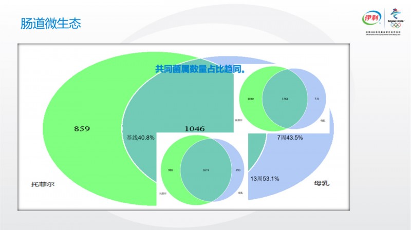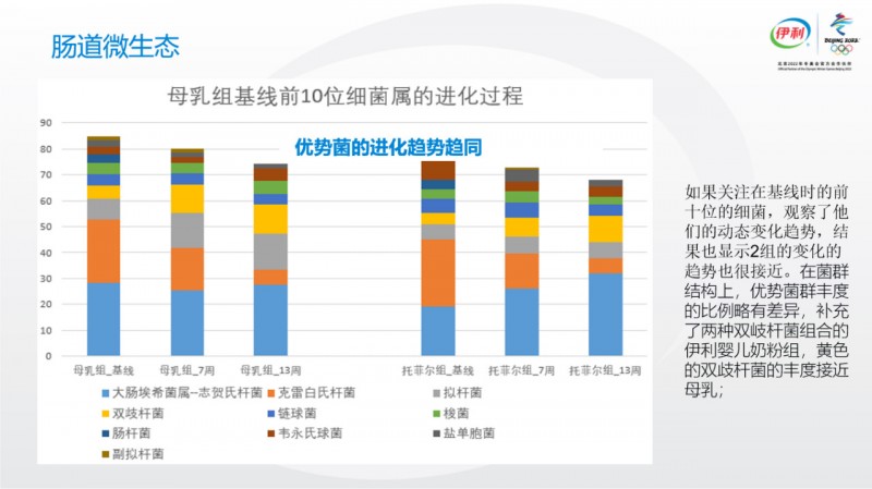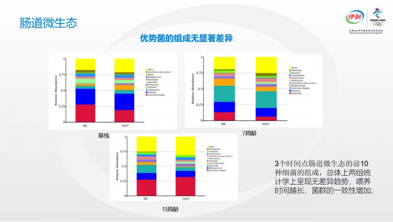 在肠道微生态的优势菌的组成上,我们做了伊利奶粉组和母乳组的对照,会看到在基线、7周龄和13周龄这三个时间点上,前十个种类的细菌组成上总体上伊利奶粉组和母乳组呈现一个无差异的趋势,喂养时间越长,菌群的一致性还在增加。