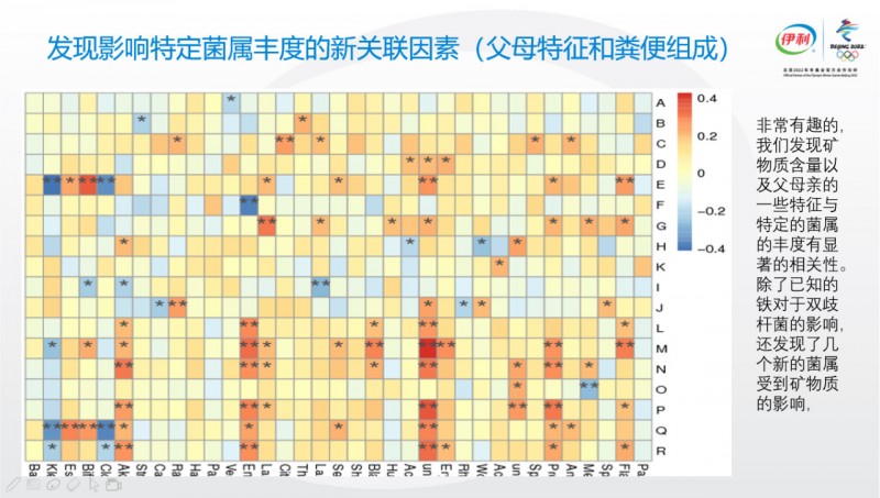 我们这个研究也有一些新的发现,非常有趣的是,我们发现矿物质的含量以及父母的一些特征,与特定菌属的丰度有一定的相关性的。