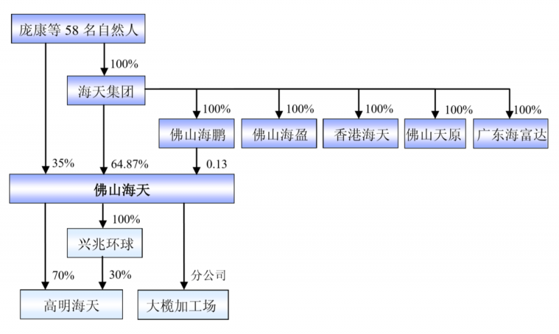 2010年11月30日,“海天有限”改制为股份有限公司,简称“佛山海天”。12月,“海天集团”全体股东——庞康等58名自然人,以现金认购海天股份2.5亿新股,占扩大后总股本的35%。“海天集团”投持有65%股股。庞康、程雪、黎旭晖等8位为共同控制人。