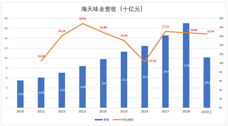 2015年营收突破100亿,但2016年增速回落至10.3%。2017年营收146亿、增速达到17.1%;2019年H1营收102亿,同比增长16.5%。这是海天味业首次半年营收突破100亿。