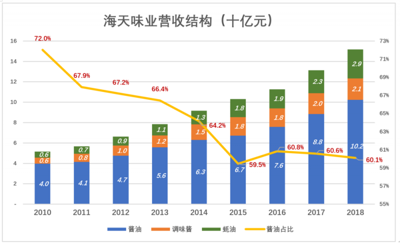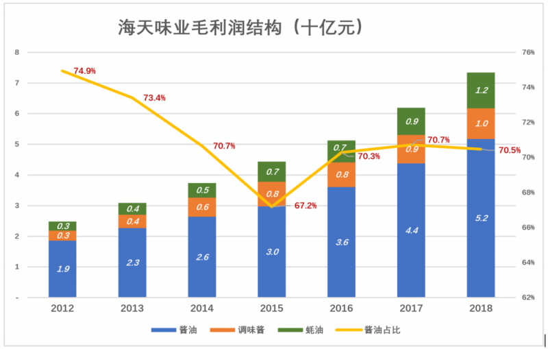 酱油以60%的营收贡献了70%的毛利润,其次是耗油。2018年,酱油、蚝油、调味酱毛利润分别为52亿、12亿和10亿。
