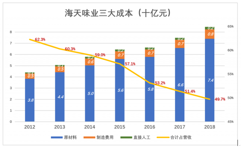 不论是酱油、蚝油还是调味酱,主要生产成本都包含三个部分:原辅材料(含包装材料)、直接人工、制造费用(水、电、能源、折旧等)。