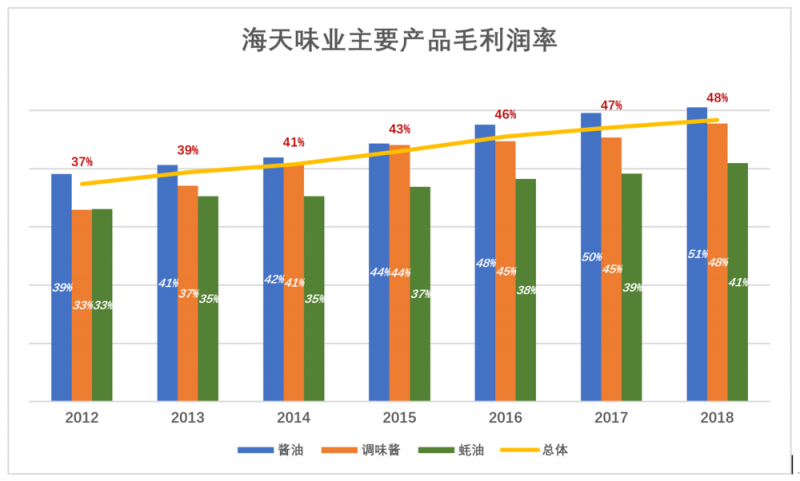 2012年以来,海天毛利润率提高了12个百分点,2018年达到48%。其中酱油、调味酱、蚝油毛利润率分别为51%、48%、41%。