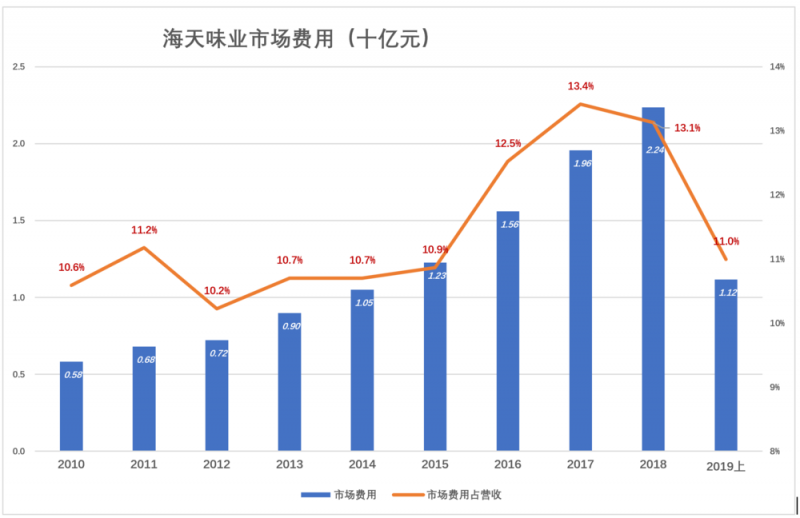 2019年H1,市场费用11.2亿、占营收的11%。由于调味品牌的销售旺季在下半年,2019年H2海天味业市场费用将再创新高,占营收的比例不会低于2018年的水平。