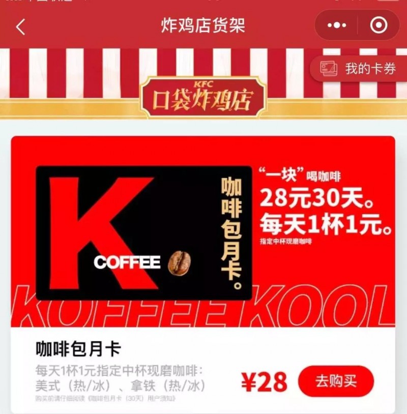 9月9日,肯德基推出了咖啡月卡,售价28元,可以提供持续30天、每天一杯的定制咖啡,总共50万份,售完即止。