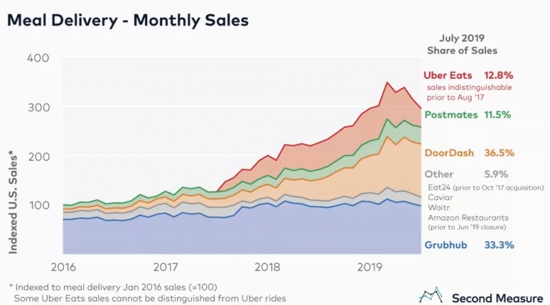 根据Second Measure最新数据,今年7月,DoorDash占据36.5%的市场,位列第一,而GrubHub紧跟其后拿下33.3%的市场。
