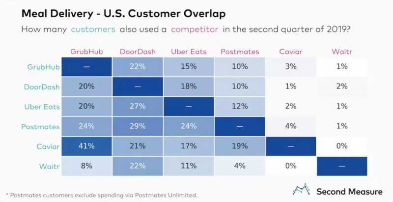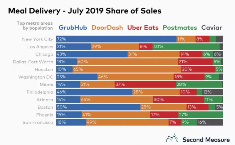 从图上可以看出,全美国范围内增长速度最快的是Uber Eats,其市场份额增加到12.8%,位列第三。一直声称要IPO的Postmates暂时排在最后,享有11.5%的份额。