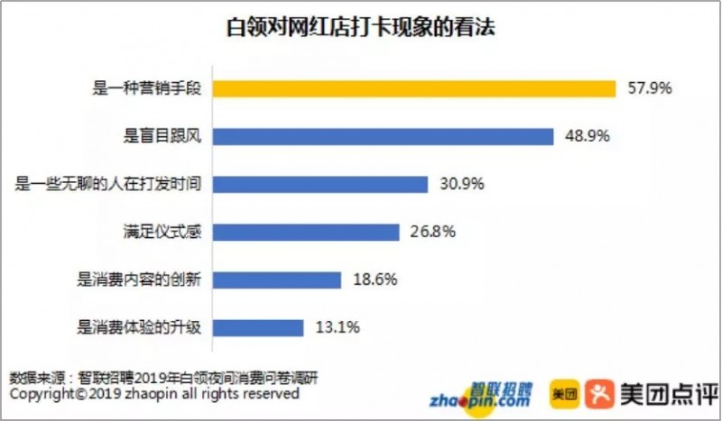 在研究里可以看到,将近六成的人认为网红店纯属于一种营销手段,也有将近五成的人表示打卡网红店多是在盲目跟风。