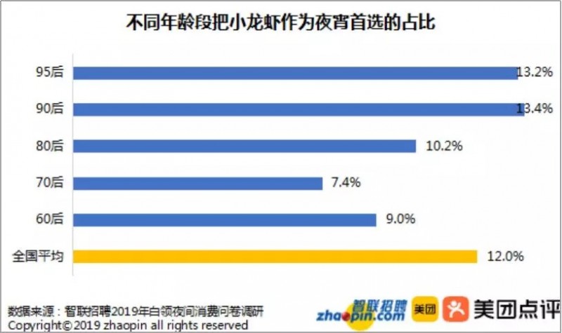 在吃小龙虾年龄分布中,90后和95后是最喜欢吃小龙虾的群体,占比均大概是13%,80后和60后群体也不甘示弱。