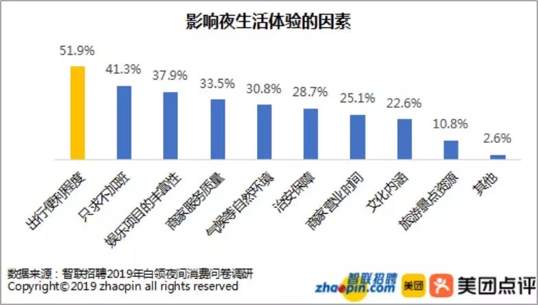 那么在影响夜生活体验的因素中,占据前三的主要是:出行便利,只求不加班以及娱乐项目的丰富性。