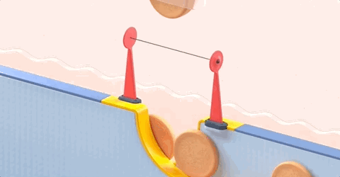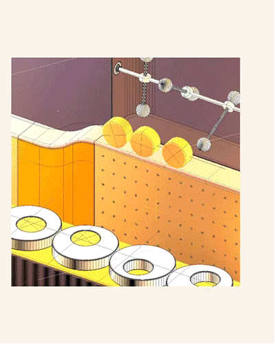 比如,鸡蛋先是玩蹦蹦床,去掉壳的荷包蛋过了滚筒又回到了最初的起点:
