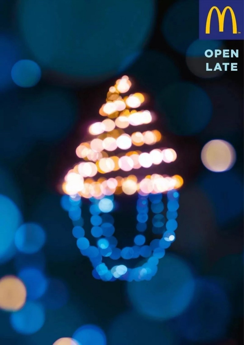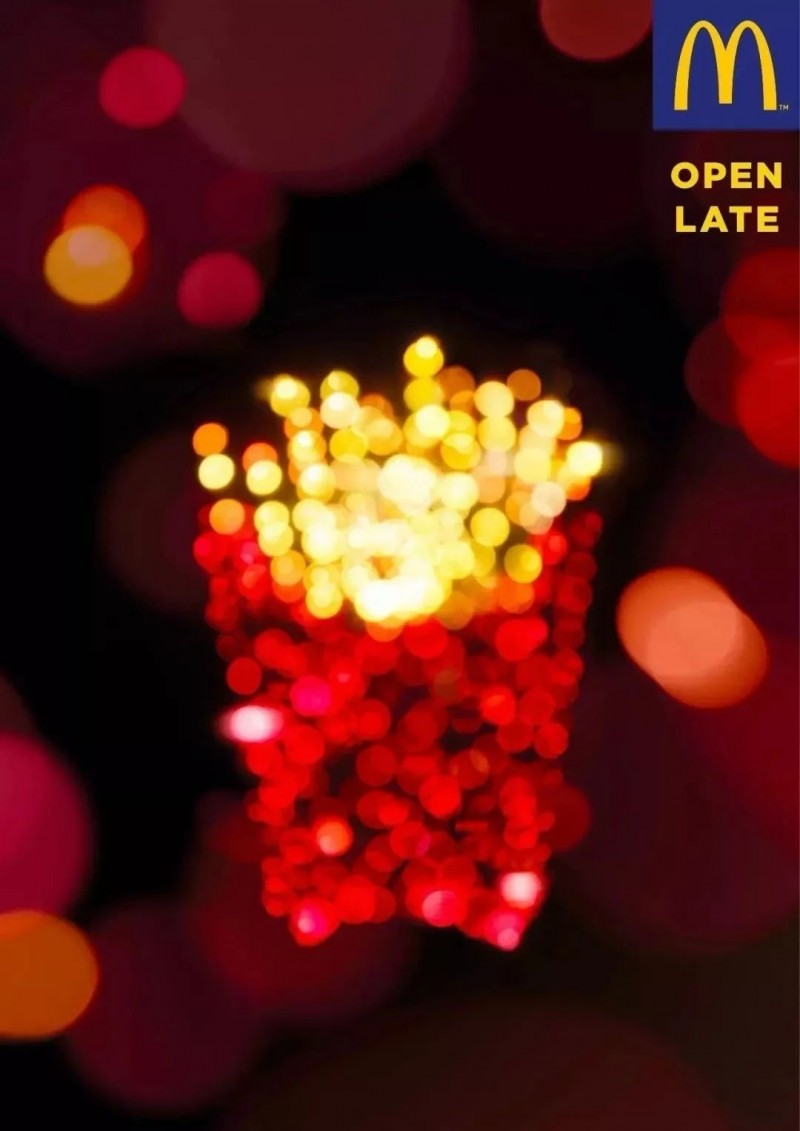 2017年麦当劳巴黎推出过一则24小时营业的广告,用灯光雕塑成汉堡、薯条和冰淇淋等产品模样,做了系列霓虹灯海报,风格简洁,梦幻感十足。