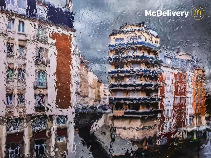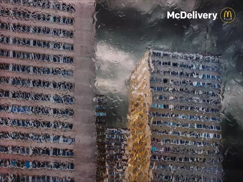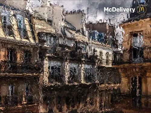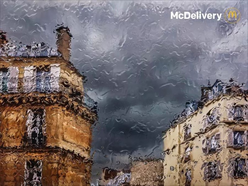 同样是法国麦当劳的创意,以城市为背景,麦当劳携手摄影师Roberto Badin做了一套亮相法国街头的户外广告——《Rain》,为雨天外送的「麦乐送」而做。