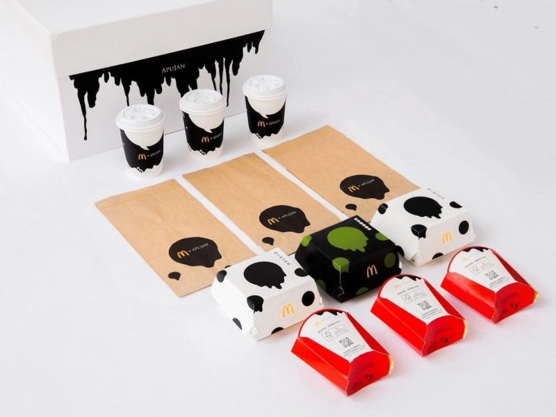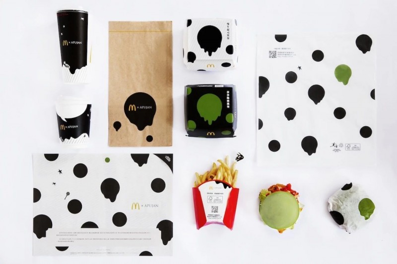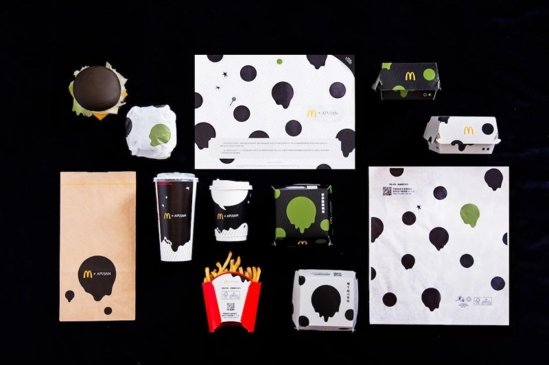 中国台湾麦当劳和设计师品牌APUJAN跨界联名推出了限量系列包装,为两款限定套餐“双牛起司黑堡”和“莎莎脆鸡腿堡”专门设计。两款汉堡也分别用天然食材黑色的墨鱼汁和绿色的蔬菜汁。