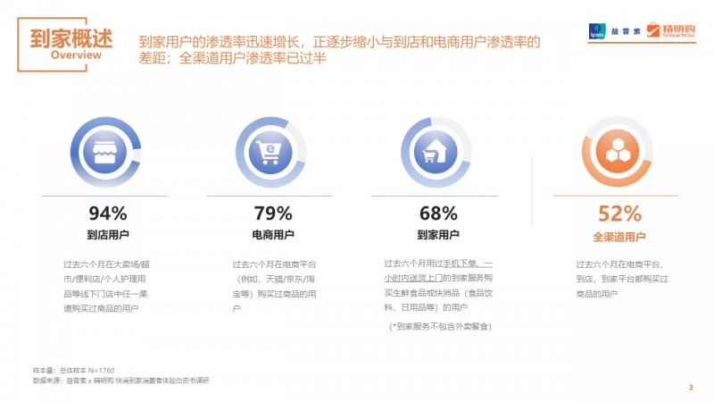 调研显示,52%的受访用户表示他们在过去的六个月中在电商,到家,到店都购买过相关商品。其中新兴、快捷的快消到家平台用户渗透率为68%,与电商平台的用户渗透率(79%)相比差距正逐渐缩小,可见快消到家平台的市场发展潜力之大。