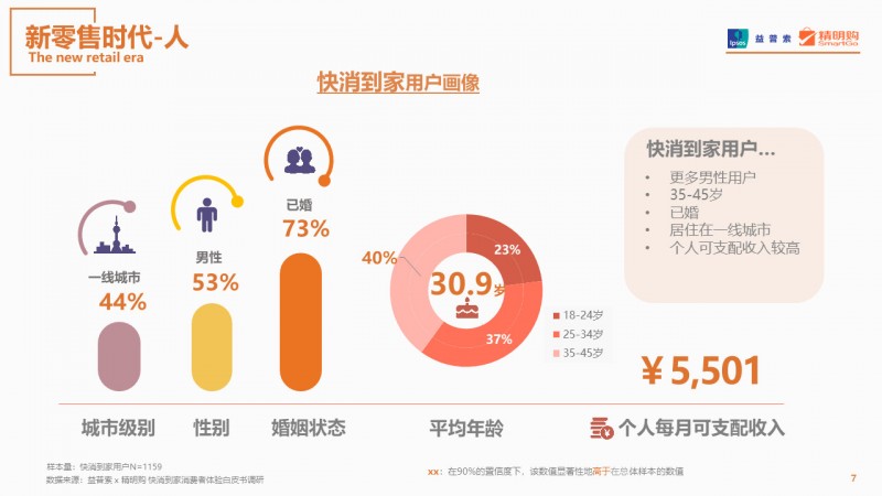 使用快消到家平台的用户男性居多(53%),平均年龄30.9岁,一线城市用户占比44%,其中73%的用户是已婚人群,个人可支配收入约为5501元。