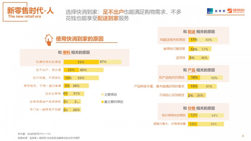大众为什么要选择快消到家服务呢?不仅仅是由于服务非常便利(87%),足不出户也能满足购物需求,不多花钱也能享受配送到家服务。