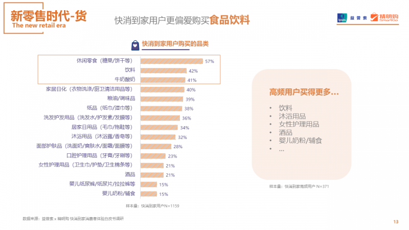 调研显示,快消到家用户更偏爱购买食品饮料,最喜欢购买的产品为休闲零食(57%),饮料(42%),牛奶酸奶(41%)。