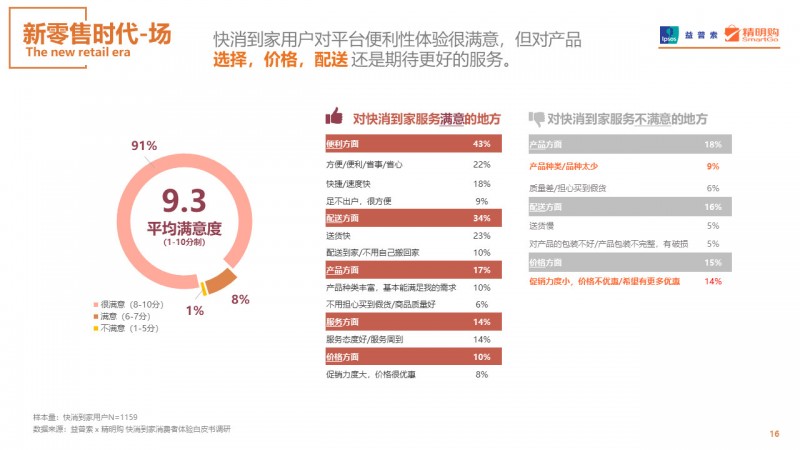 消费者对于快消到家整体的服务体验非常的满意,其中有91%的用户表示很满意,平均满意度也达到了9.3分(满分10分)。其中便利是此平台的一大优势,而产品可选种类,价格,和配送方面,还需要进一步优化。