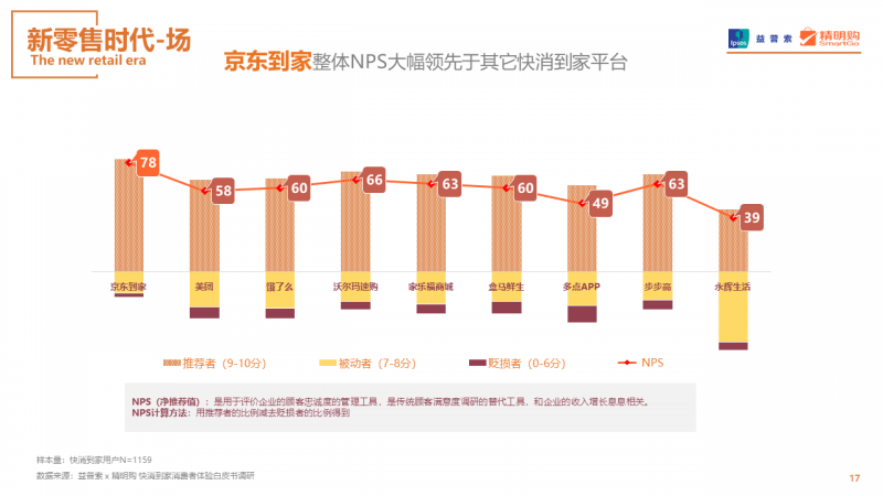 调研显示,最受消费者青睐的快消到家平台为京东到家(73%),美团(66%),饿了么(57%)。京东到家整体的NPS大幅领先于其他到家平台,促销力度大,产品选择多,售后服务好是其大幅领先的根本原因。