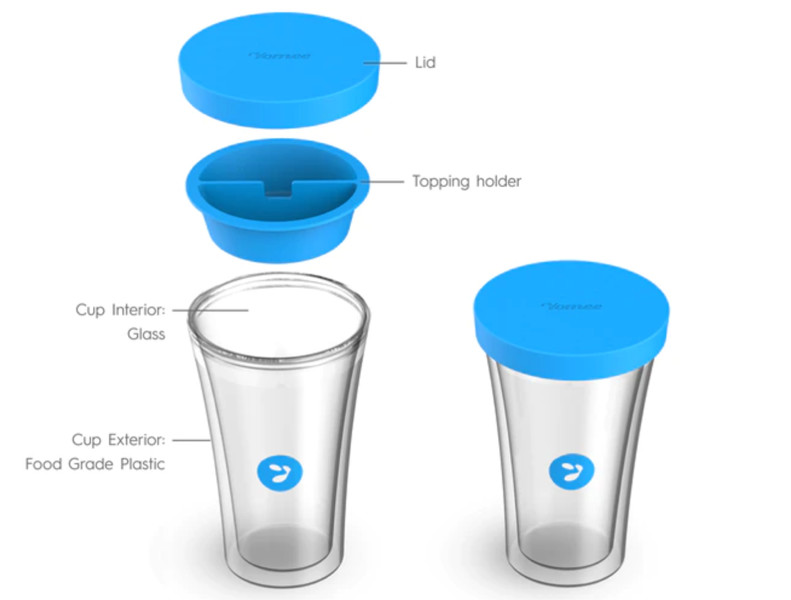 制作好的酸奶可以倒入Yomee设计的双层保温杯来保持低温新鲜,让使用者随时随地享用酸奶。除此之外,Yomee在还在杯顶设计了一个配料托,让配料和酸奶在杯内分开储存,使用者可以在食用时再将二者混合。