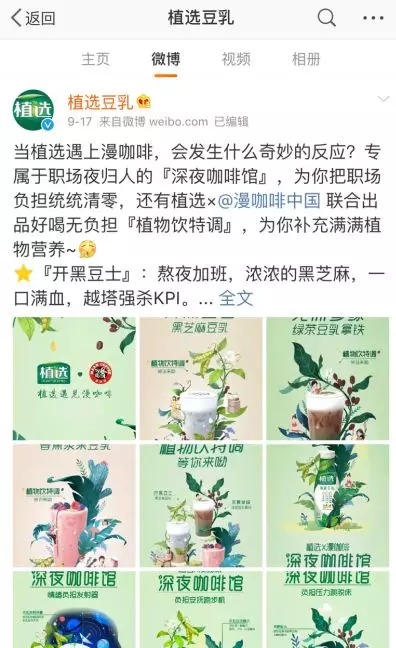 9月17日,植选豆乳在微博上正式官宣,与漫咖啡达成合作共同推出三款植物饮特调:香浓可口的“开黑豆士”、清爽酸甜的“莓有一丝焦虑”、提神醒脑的“无需多绿”,颜值创意俱佳,一时间引发全网关注。