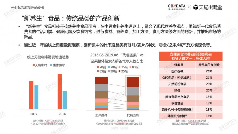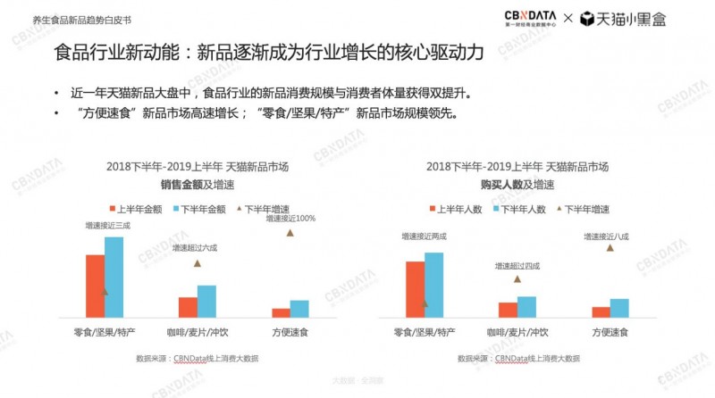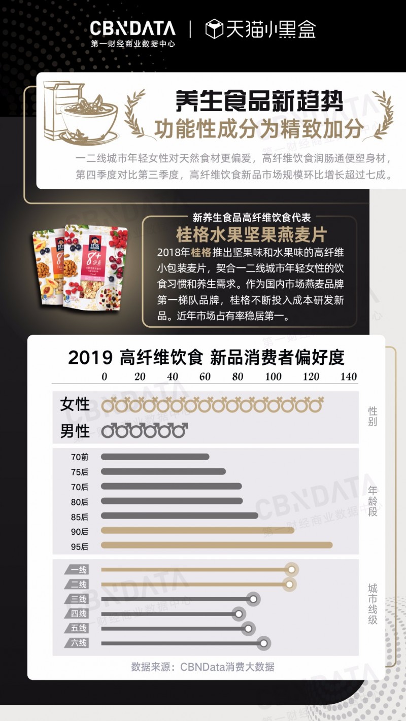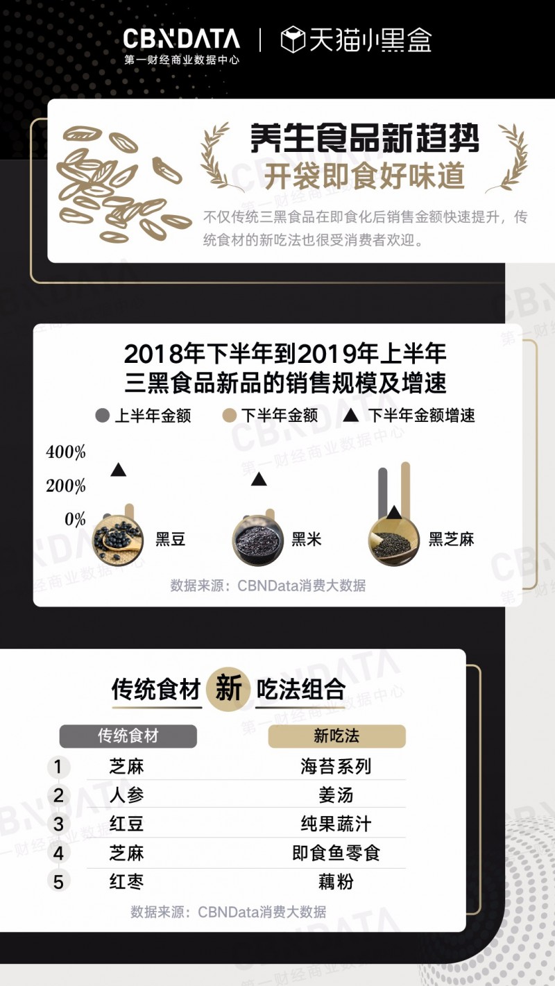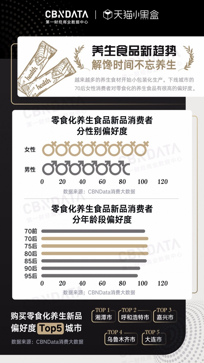 10月,天猫小黑盒联合第一财经商业数据中心(CBNData)发布《养生食品行业新品趋势白皮书》,同时为消费者提供养生指南推荐美食新品,正是洞察到养生食品的新品消费需求及市场变化后启动的。