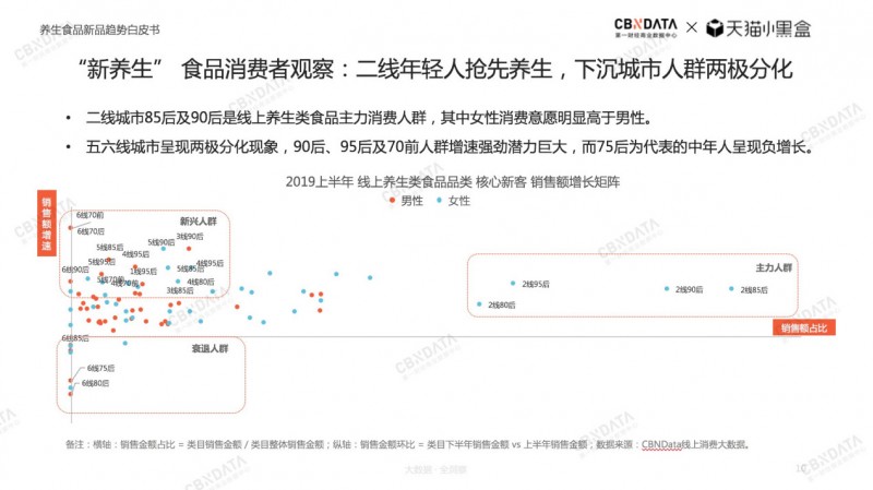 从消费者洞察方面来看,二线城市的85后和90后人群是养生类食品的消费主力,其中女性消费者意愿明显高于男性。值得注意的是,下沉市场的95后及70前消费者增速强劲,潜力巨大。