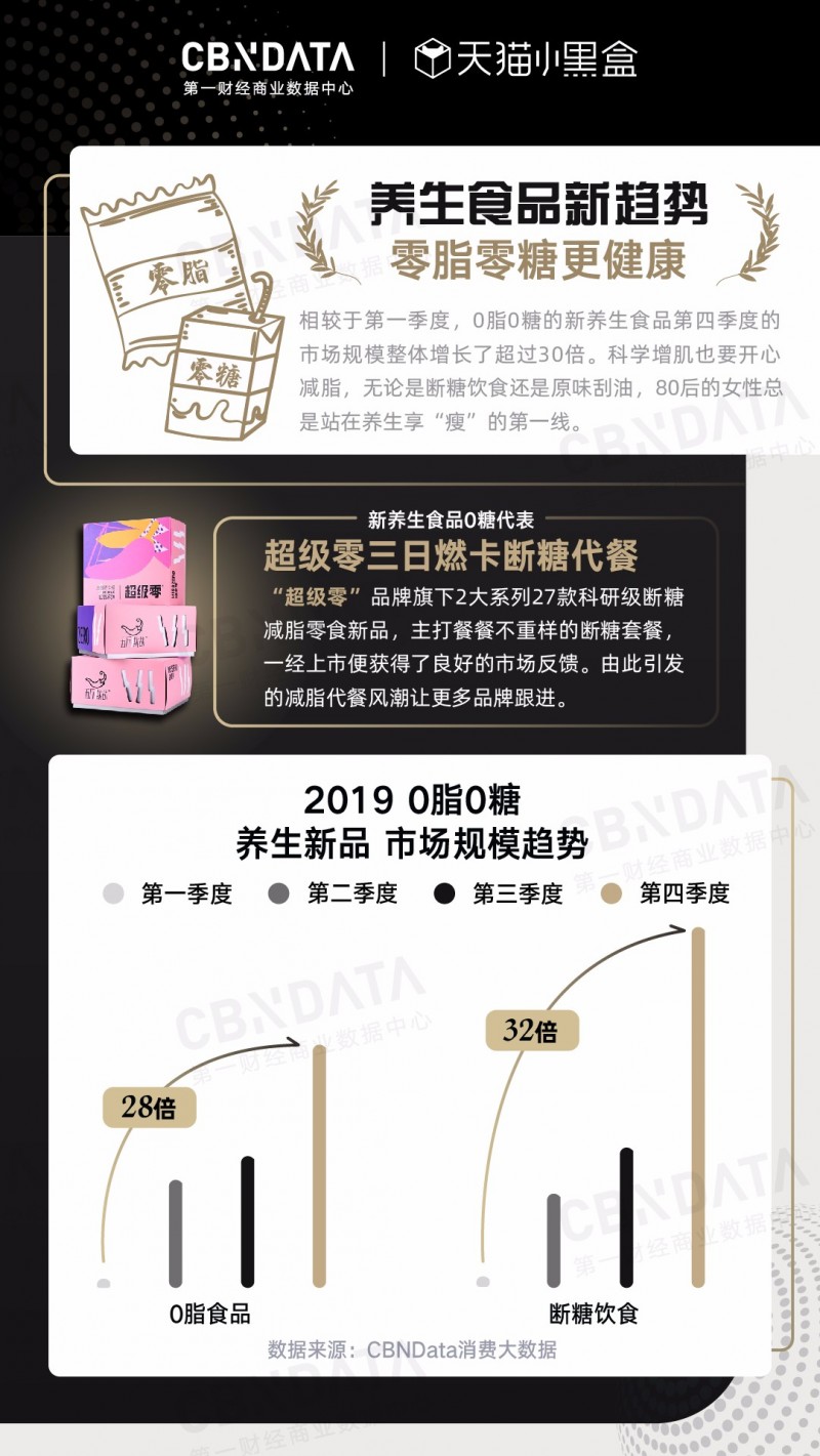 CBNData《报告》显示,通过控制饮食摄入来达到瘦身美体的0脂0糖新养生食品,第四季度市场规模较第一季度整体增长超过30倍。