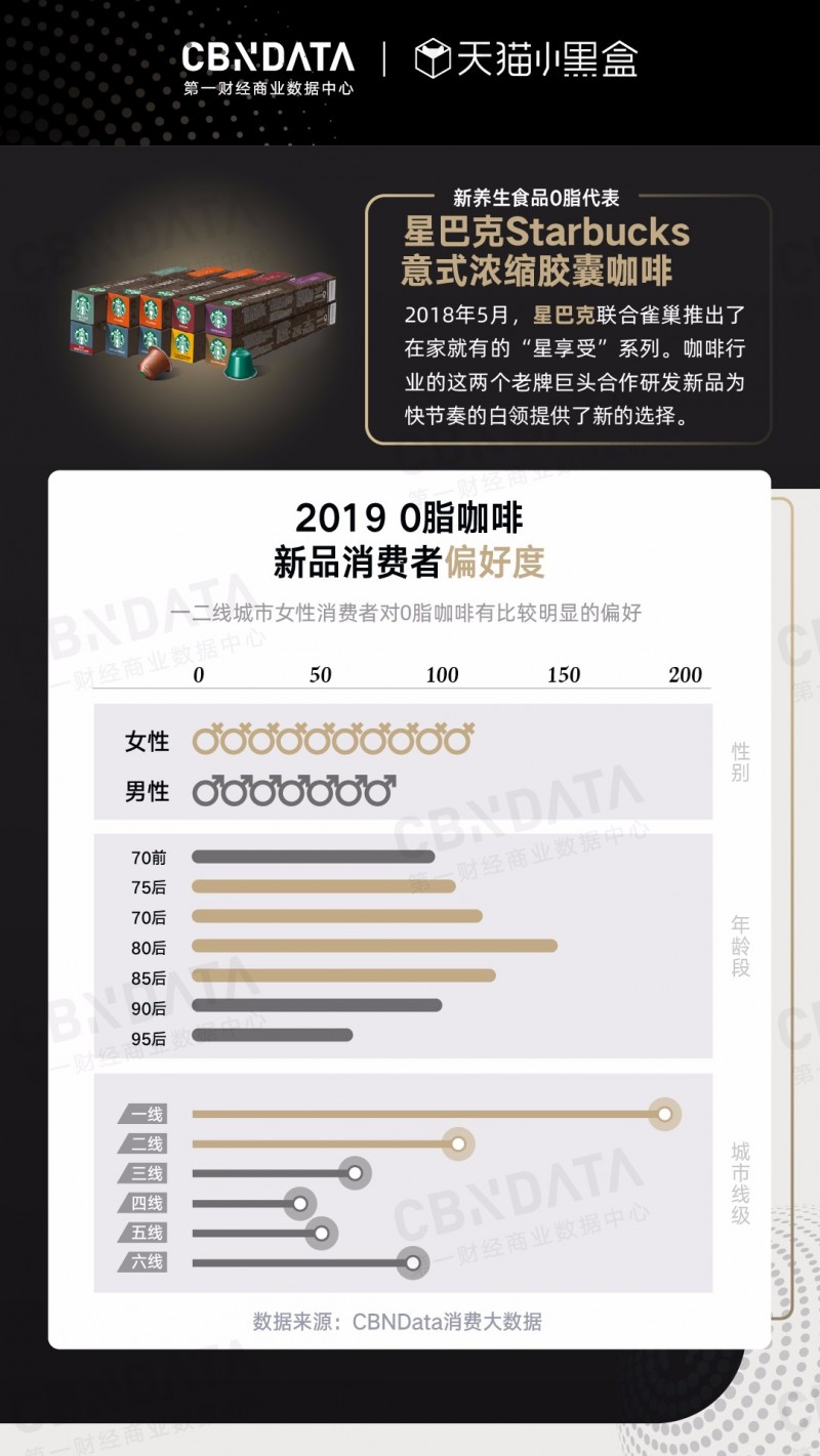 4、 以“0脂0糖”为卖点的“新养生”食品市场规模增长超过30倍,星巴克联合雀巢推出的“星享受”系列胶囊咖啡、超级零历时18个月研发的三日燃卡断糖代餐,是其中的代表新品。