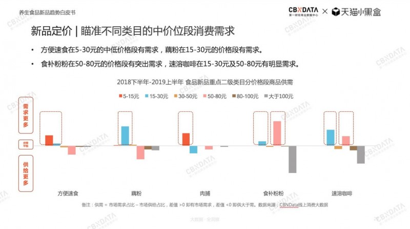 新品应该卖多少钱?怎么卖?CBNData《报告》显示,食品行业新品普遍呈现单款销量更突出的特点。整体来看,中价格段的食品新品供小于求,存在市场机会。如方便速食在5-30元的中低价格段有需求,食补粉粉在50-80元的价格段有突出需求,速溶咖啡在15-30元及50-80元有明显需求。