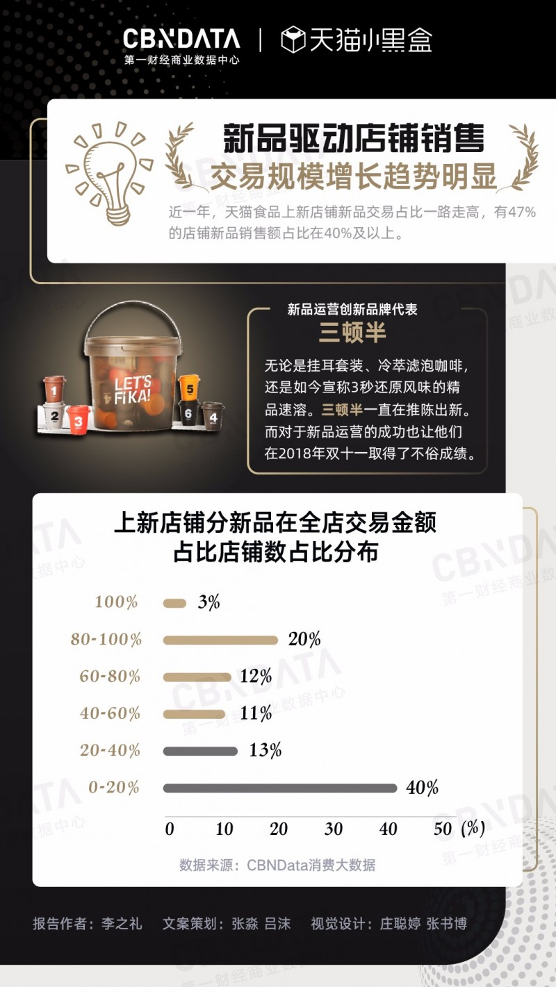 新品运营方面,近一年,天猫食品上新店铺的新品交易占比一路走高,有47% 的店铺,新品交易金额占全店的 40% 及以上。品牌店铺可考虑制定新品驱动的增长策略。