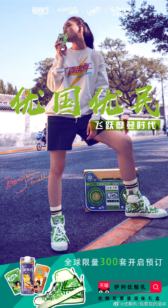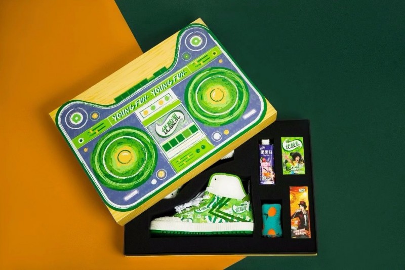 拥有酸甜滋味的优酸乳不单加入“东鞋西渡”与飞跃合作推出联名潮鞋,还携手负责“东鞋西渡”的香奈儿合作设计师Eric Bongiovani推出摩登复古礼盒。设计师将其对于城市文化的热情以及对涂鸦艺术和街头艺术的狂热爱好融入设计,以复古收音机为主题的街头复古礼盒就这样随着音乐的节拍诞生了。其中不言而喻的潮流时尚语言引发周冬雨、潘玮柏等顶级明星打call,瞬间燃爆时尚跨界的国潮。