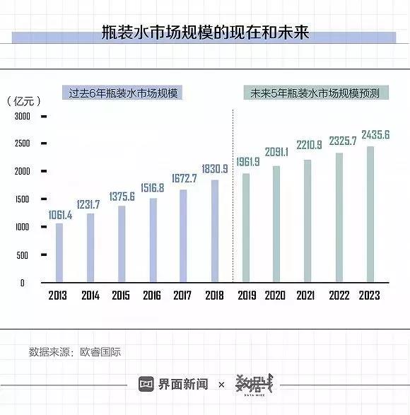 欧睿国际数据显示,从2012年开始,瓶装水取碳酸饮料品类地位而代之,成为软饮料行业中最大的子行业,市场份额占比达30%以上;市场规模也已从2013年的1061.4亿元增长至2018年的1830.9亿元,预计未来五年其复合年均增长率为9.5%,将成为高速增长的饮品品类之一,更有可能在2020年突破2000亿大关。