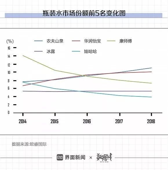 据尼尔森数据显示:截止到2018年年底,农夫山泉瓶装水市占率高达28.3%,营收209.11亿元,同比去年的177.91亿元增长17.54%,并有望在2019年内达成30%的市场销售占比;怡宝在2018年底的市场占有率则超过了22%,营业额超138亿,稳居全国第二。百岁山以占比10.1%位列第3,康师傅、冰露、娃哈哈依次紧随其后。