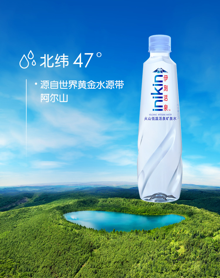 inikin是少数民族鄂伦春的语言,含义为“活泉”,既是水源“火山低温活泉”流动活水属性的高度提炼,也充分代表了品牌希望给消费者的自然活力与愿景。因此,伊利选用“伊刻“命名,与inikin同音,伊代表万物伊始,如水赋予万物最初的生机,同时秉承母品牌“伊利即品质”的理念,为品牌做强力的品质背书。伊刻亦谐音“一刻”,寓意在每一个时刻,用不断涌动的活水,给予身体更健康的活力,给予生活更高品质的体验。